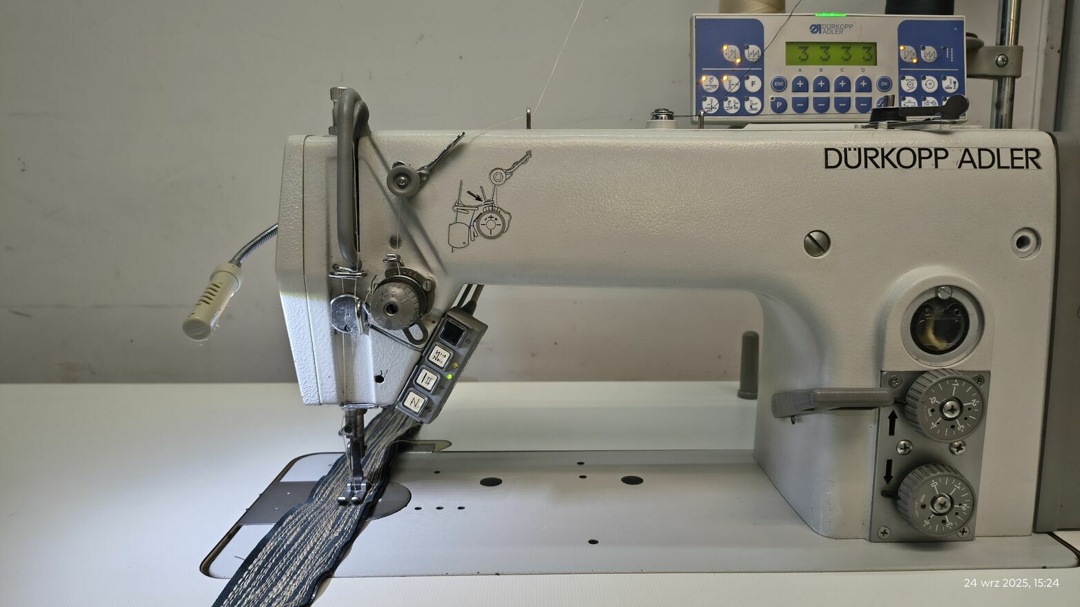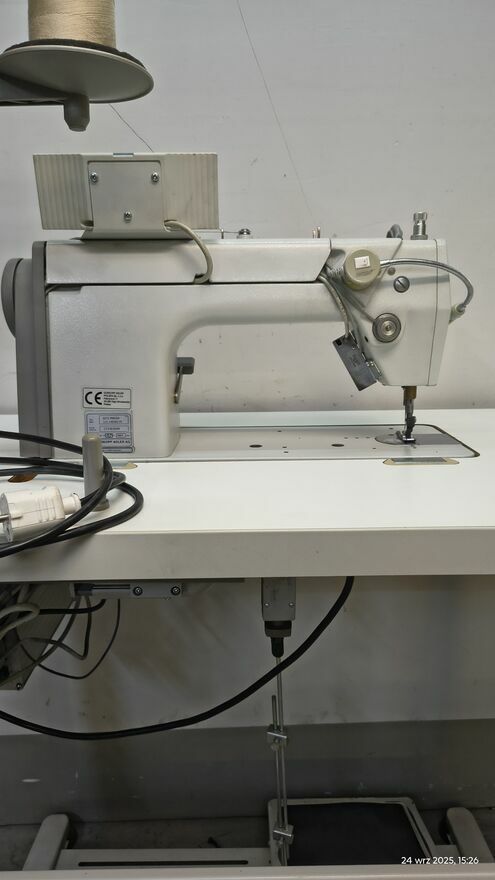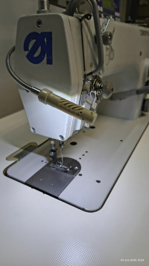 Stębnówka płaska z transportem dolnym ząbkowym, igłowym oraz z automatyką z funkcjami:obcinanie nici,